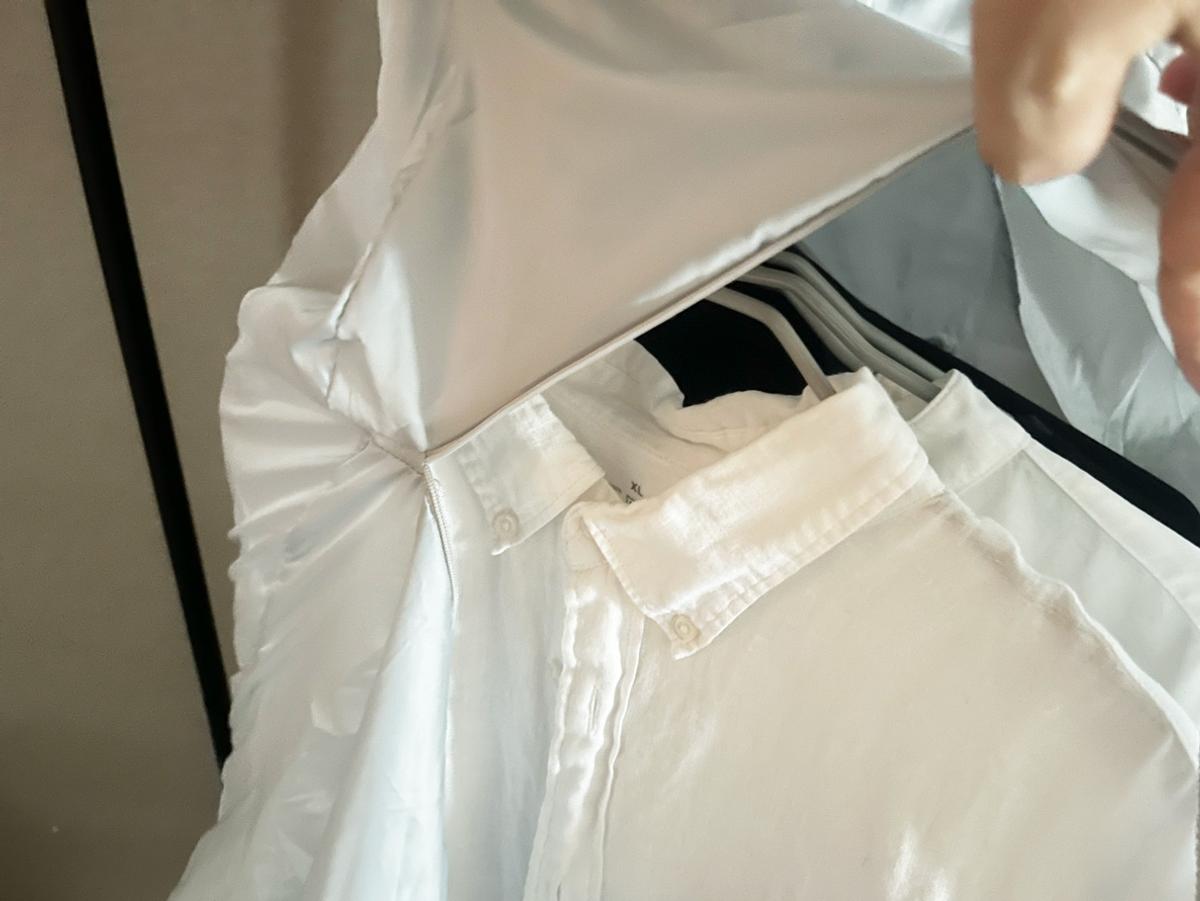 かけたら、乾燥カバーのチャックをあけて、本体の底部にあるハンガーかけに衣類をかけます。今回は、明日着たいのに洗っていなかったシャツを急いで洗濯したので、こちらを乾かしてみます。