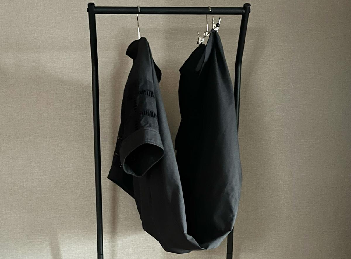 筆者はワンピースやパンツなどは、通常のハンガーとピンチタイプのハンガーを使って2方向から吊るすスタイルで乾燥しています(写真はわかりやすいようにカバーから出して撮影しました)。こちらで問題なく乾かすことができますよ!
