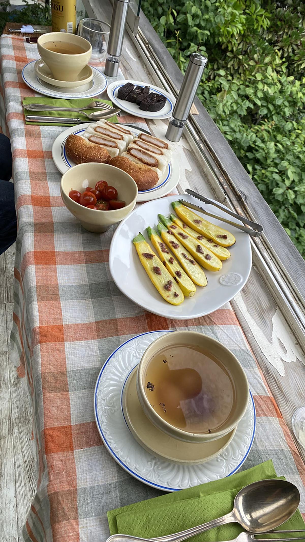 焼ミニズッキーニ、ミニアーリーレッドのスープ、マイセンのカツサンド、牛タンカレーのカレーパン、