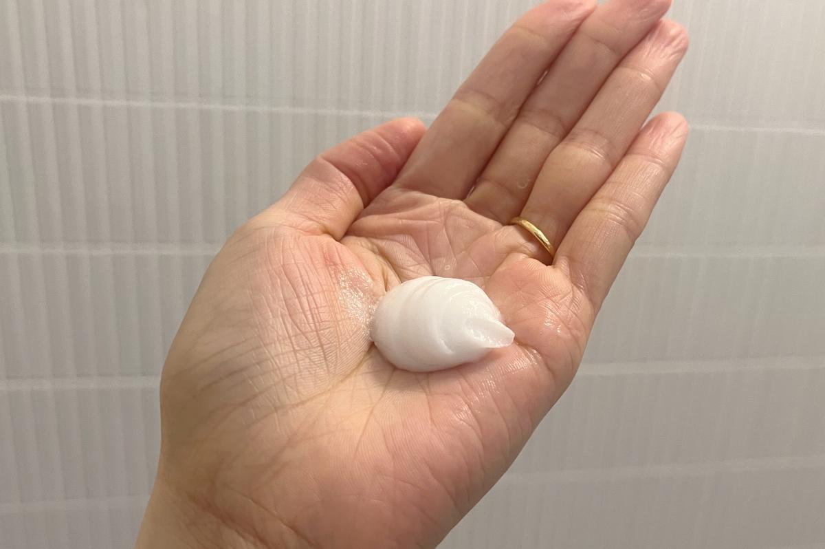 シャンプー後、軽く水気を取り適量を手に取って毛先を中心になじませていきます。テクスチャーは固めでしたが、水分を含ませるとゆるくなり髪全体にすぐに行き渡らせることができました。
