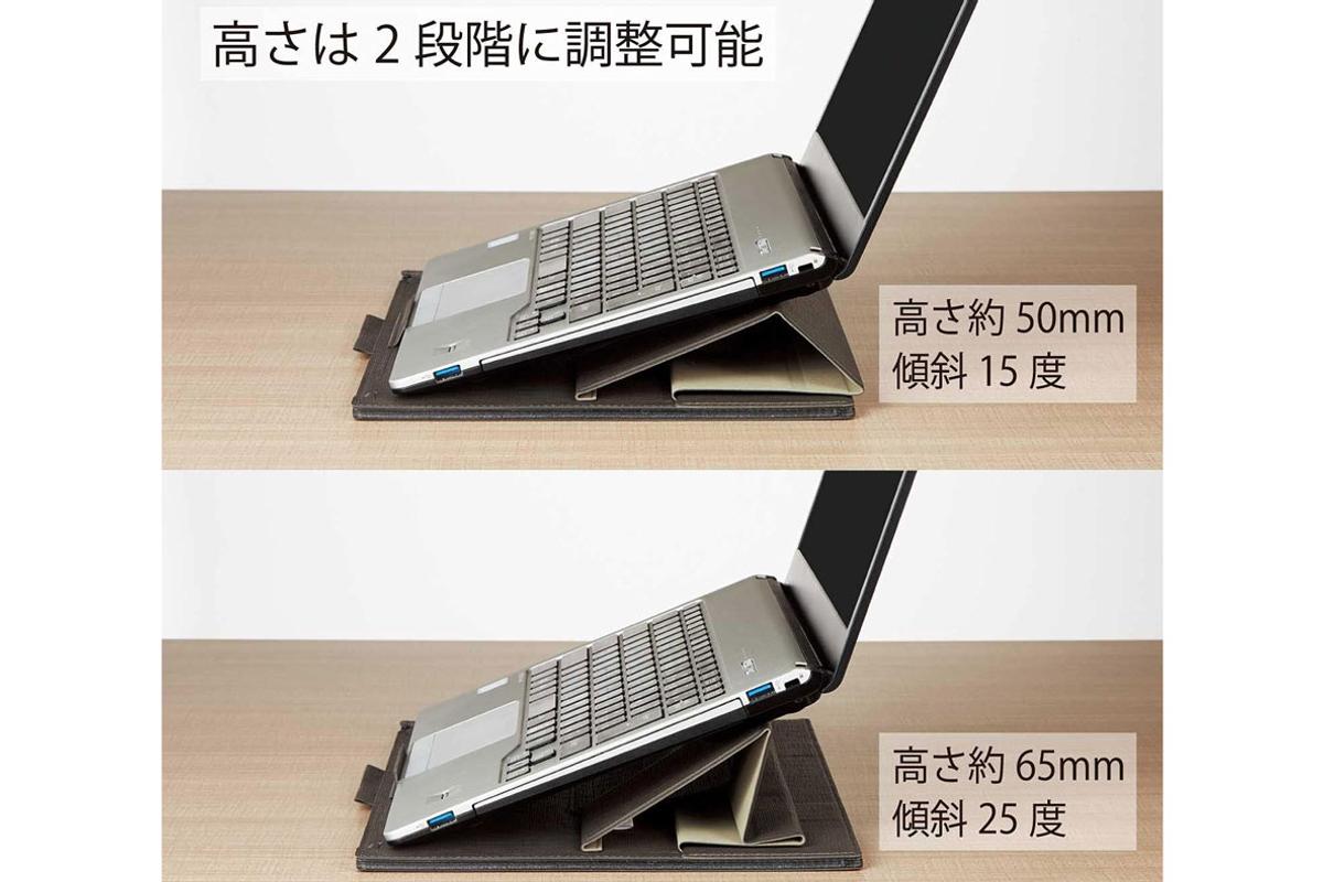 しっかり安定していて、角度は15度/25度の2段階調節が可能など、ノートPCスタンドとしての機能も充実しています。