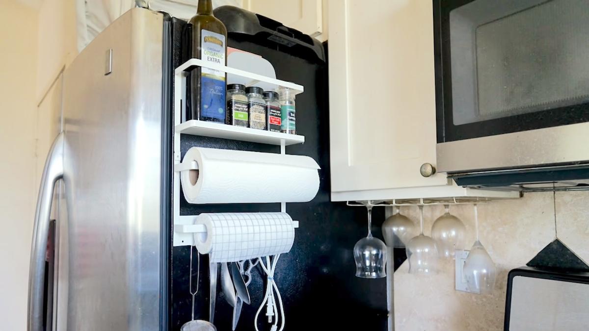 近年「浮かせて」収納するアイテムが増えましたが、山崎実業の「マグネット冷蔵庫サイドラック」は、冷蔵庫の横に収納スペースを作ってくれるアイテム。