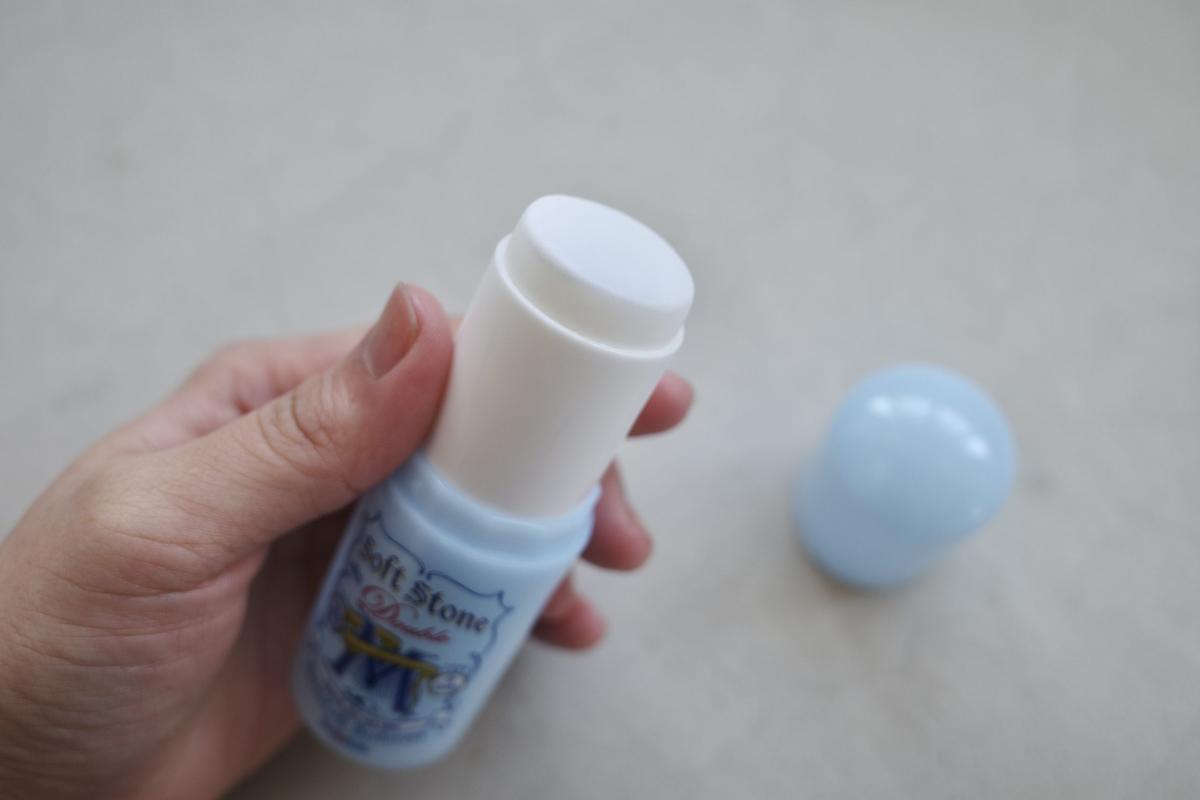 見た目はのバームのようですが、ベタつき防止成分入りの無色のソフトストーンなので、白残りせず、塗布後も何かを塗ったことを感じないくらいサラサラ。
