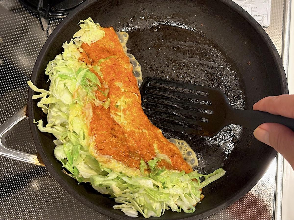 4. チーズの端がきつね色に焼けてきて、キャベツがしんなりしたら、ヘラを使ってチーズを剥がすようにして半分に折りたたむ。ヘラで3回ほど上からぎゅっと押さえて、お皿にのせる。
