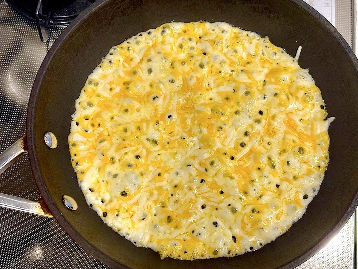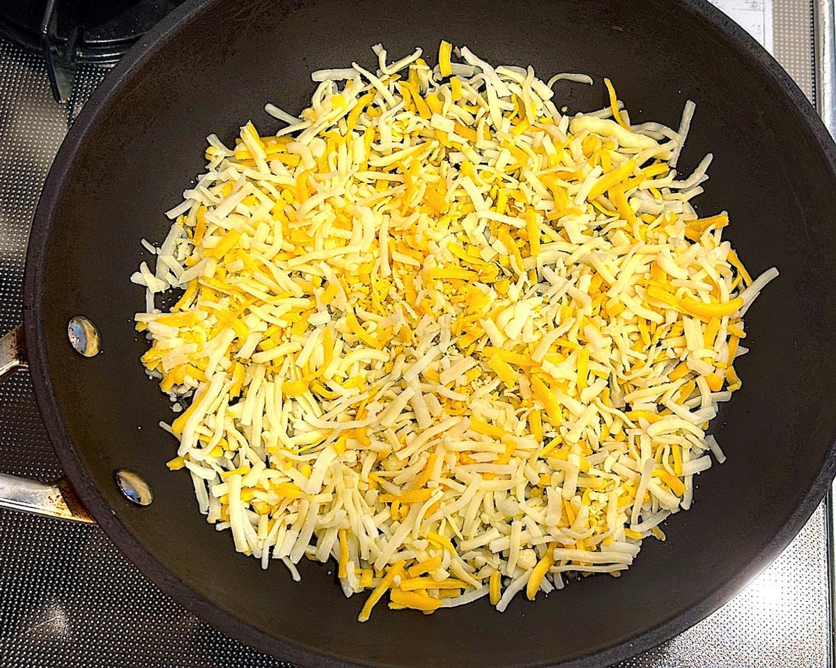 2. フライパンにピザ用チーズを敷き詰めて、中火にかける。