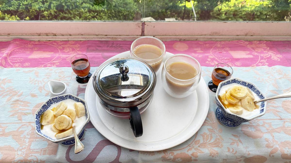 バナナヨーグルト、ブレンドのミルクティー、本日の元気。眼科クリニックで検診。