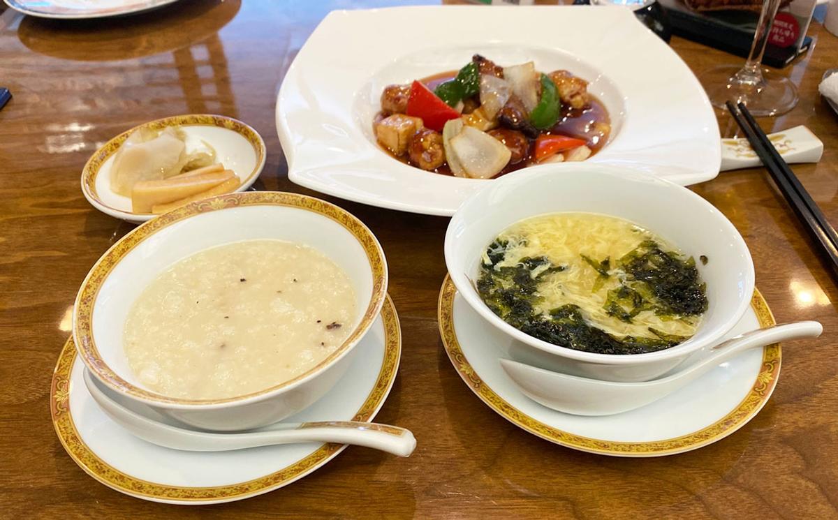 酢豚、おかゆ、お漬物、卵のスープ、タピオカココナツミルク。TORUくんに逗子駅まで迎えに来てもらった。ありがたや!