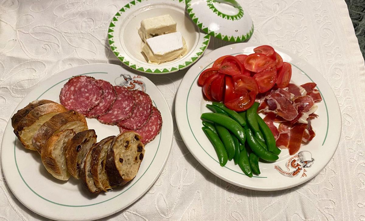 パン、サラミ、チーズ、イベリコハム、トマト、スナップエンドウ……いつも、うちのごはんは前菜的なものばかり。最後に生パイナップル。