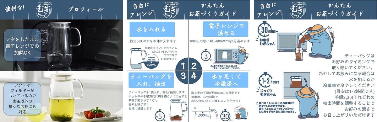 「レンジでかんたん麦茶ポット むぎちゃん」での麦茶の作り方は下記の4工程です。