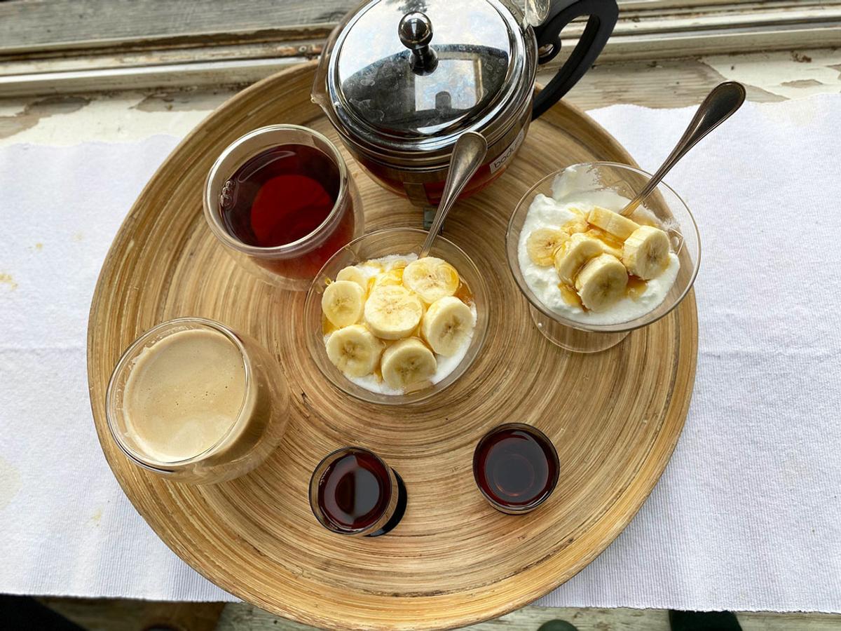 バナナ on Yoghurt、アッサム茶、本日の元気。