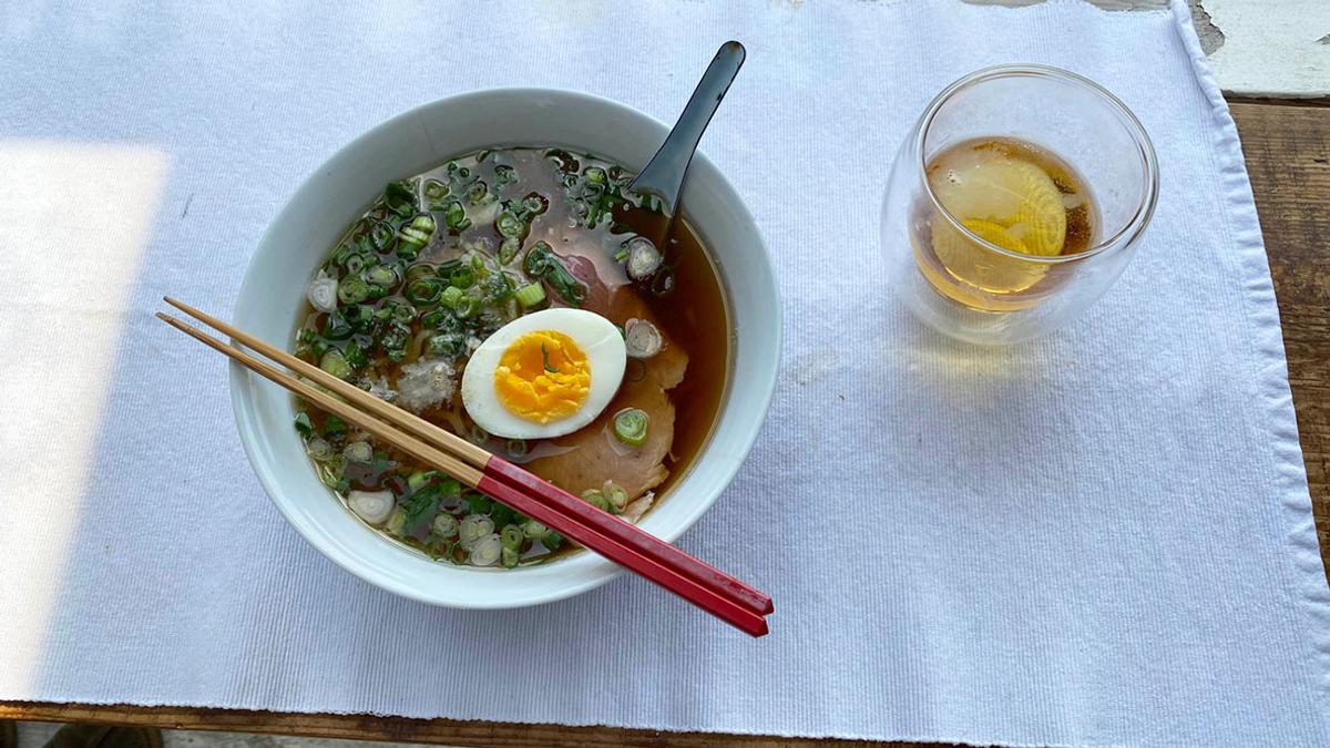 帰宅して喜多方ラーメンを作る。ゆで卵、ハム、ワケギ、ビール。