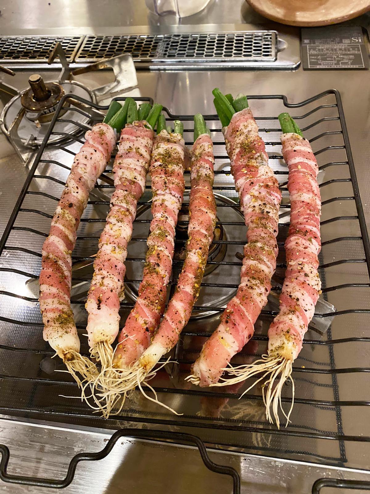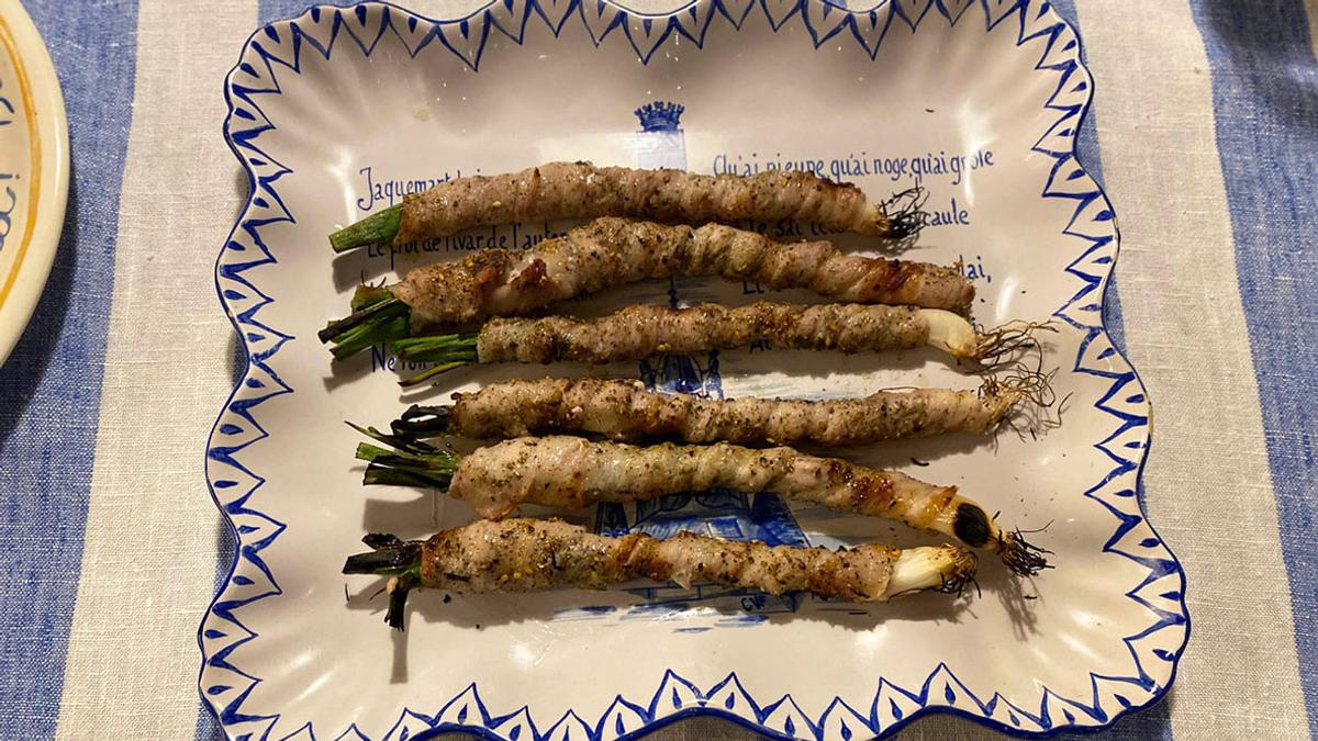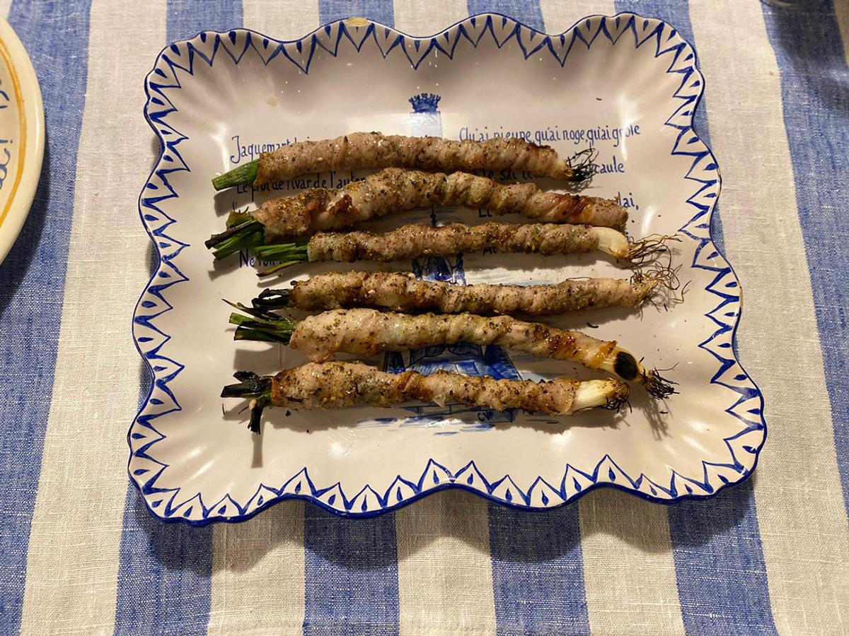 先日手に入れた「わけぎ」がとても美味しいので、これに豚バラ肉スライスをくるくる巻きつけてグリルで焼いた「Mangia e Bevi」というシチリア料理を作った(すっごく簡単)。