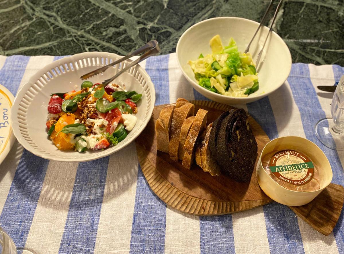 カプレーゼ(モッツァレッラ、トマト、イチゴ、せとか、バジル、調味料はサクサク醤油アーモンド)。茹でた春キャベツときゅうりとスライスチーズのサラダ。