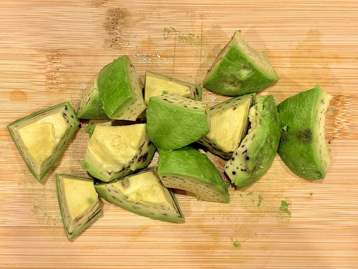 1. アボカドは半分にして種をはずし、皮をむいてひと口サイズにカットする。