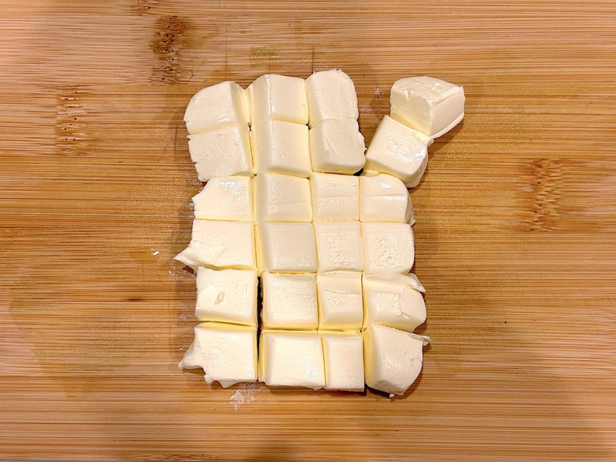 2. クリームチーズはアボカドよりも小さめのダイス状に切る。