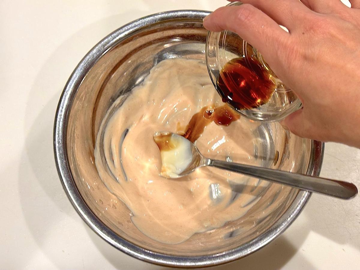 3. ボウルにマヨネーズとケチャップを混ぜ、しょうゆを加えてソースをつくる。