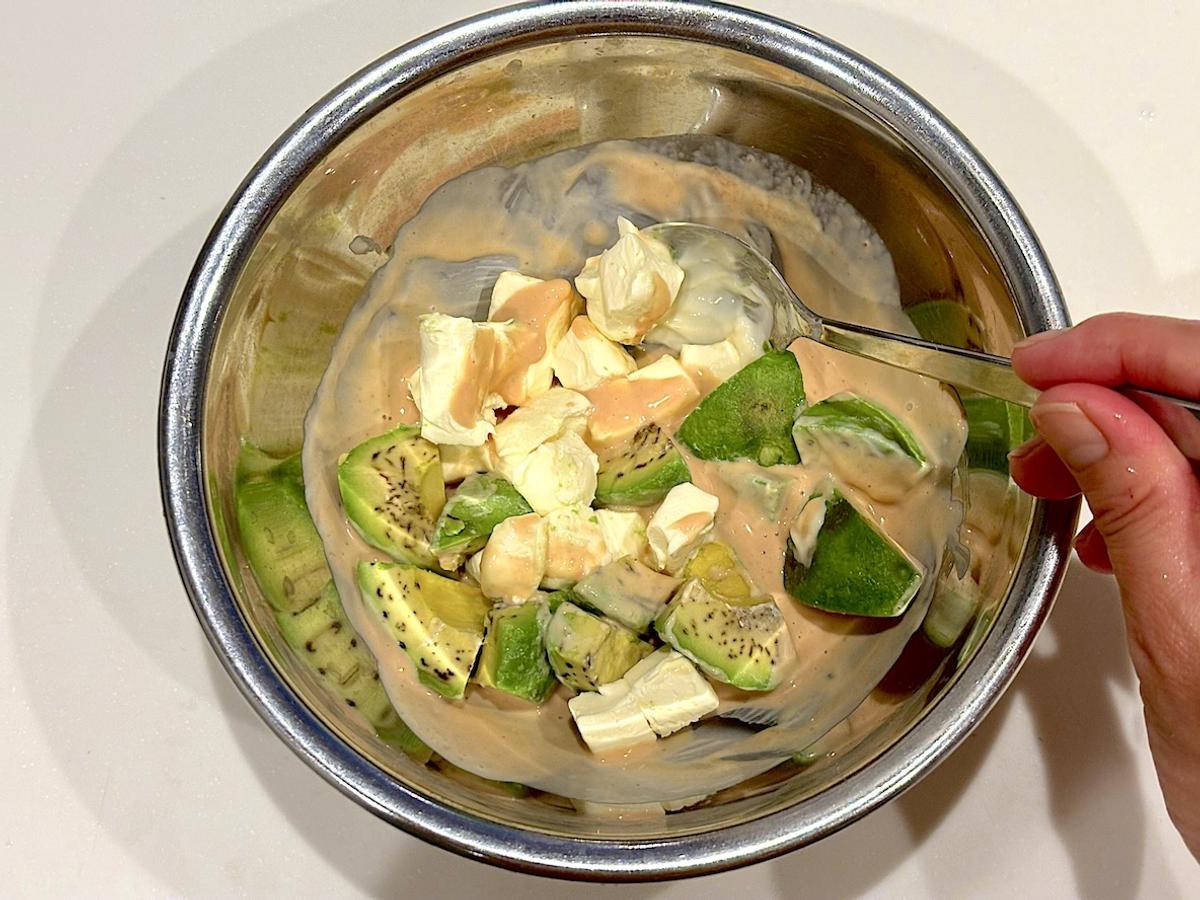 4. アボカドとクリームチーズを加え、つぶさないように優しく和える。
