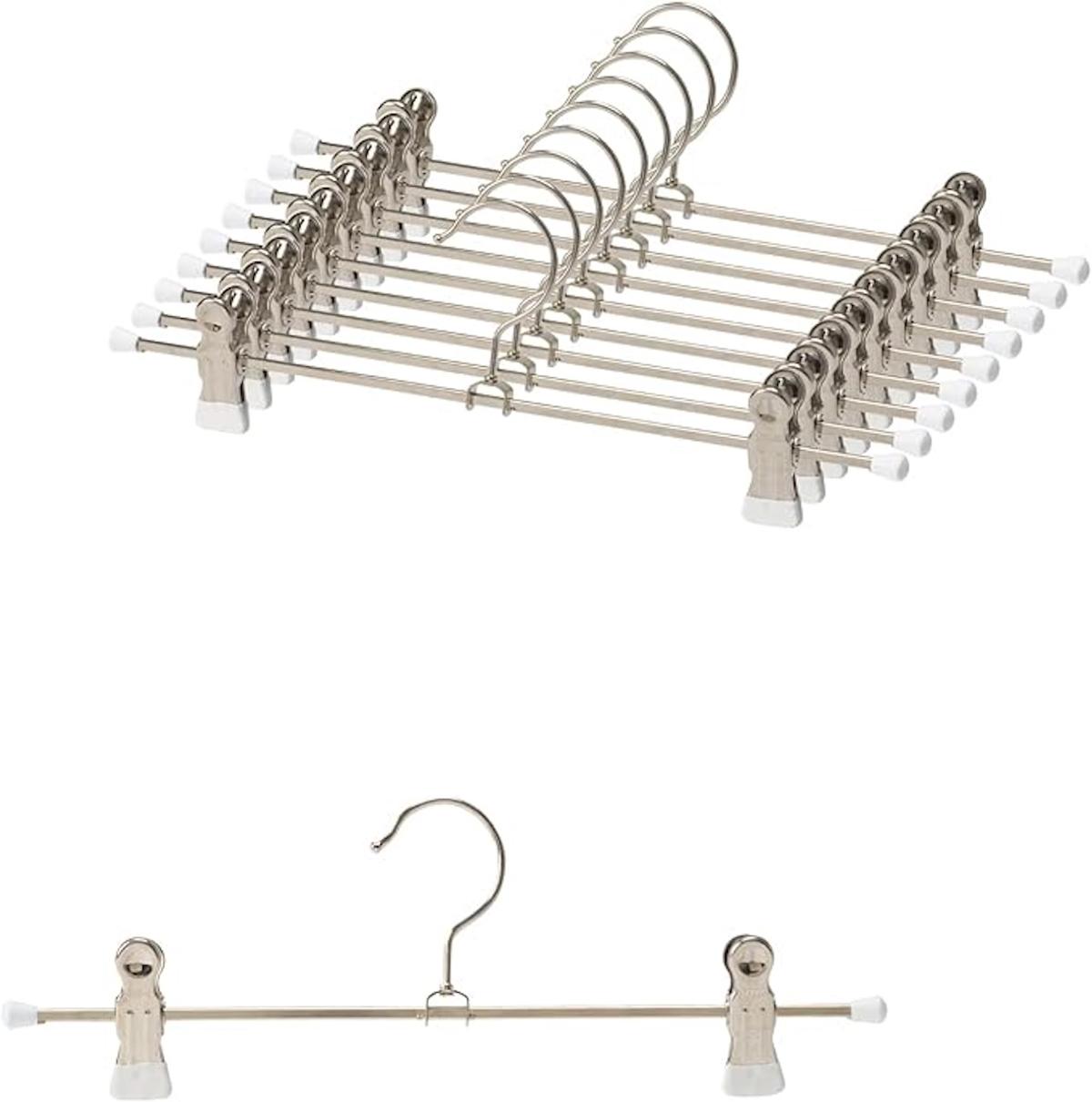 一般的なボトムス用ハンガー同様クリップがふたつ付いていますが、特徴的なのは先端がPVC樹脂で特殊コーティングされていること。そのおかげでホールド力は抜群で、ツルッとした素材のものや薄手のボトムスを挟んでも滑りにくいんです。