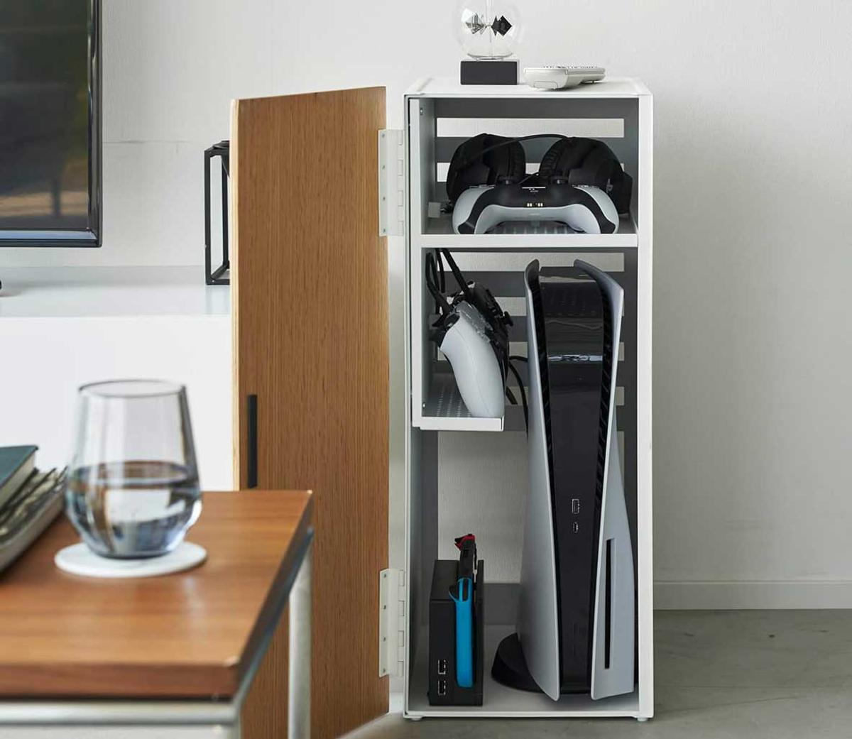 山崎実業の「ゲーム機 収納ラック」を使えば、しっかり隠しつつ今まで以上に使いやすくしてくれそうです。