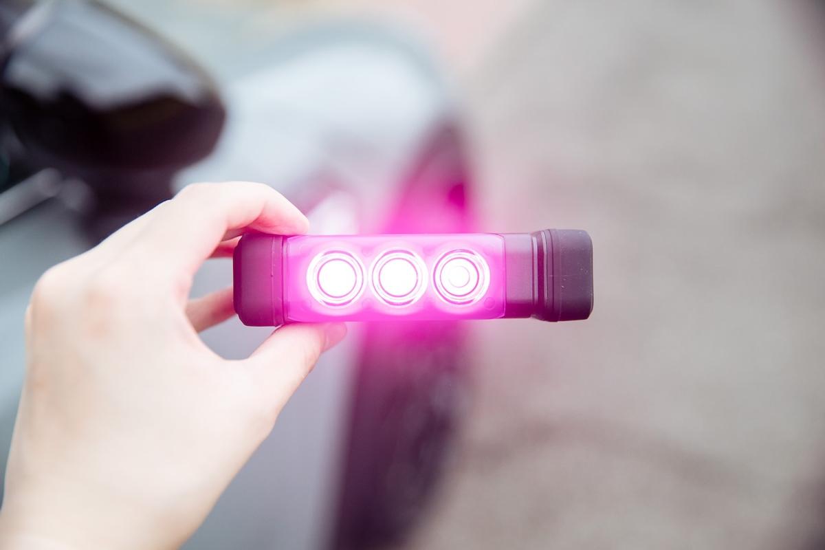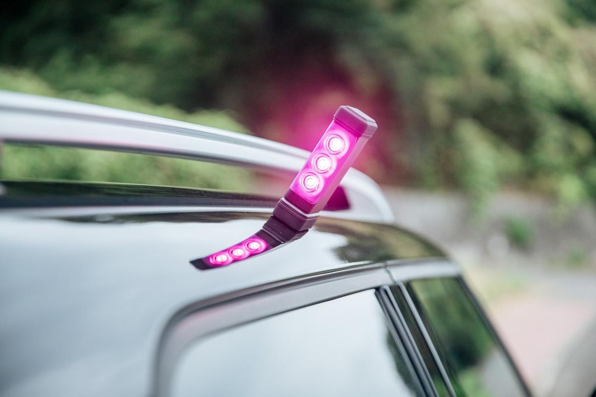 ちなみに一般的な三角表示板の場合、視認距離は約200m程度。本体そのものから発光するわけでもないので、パープルセーバーの視認性はとても心強いです。