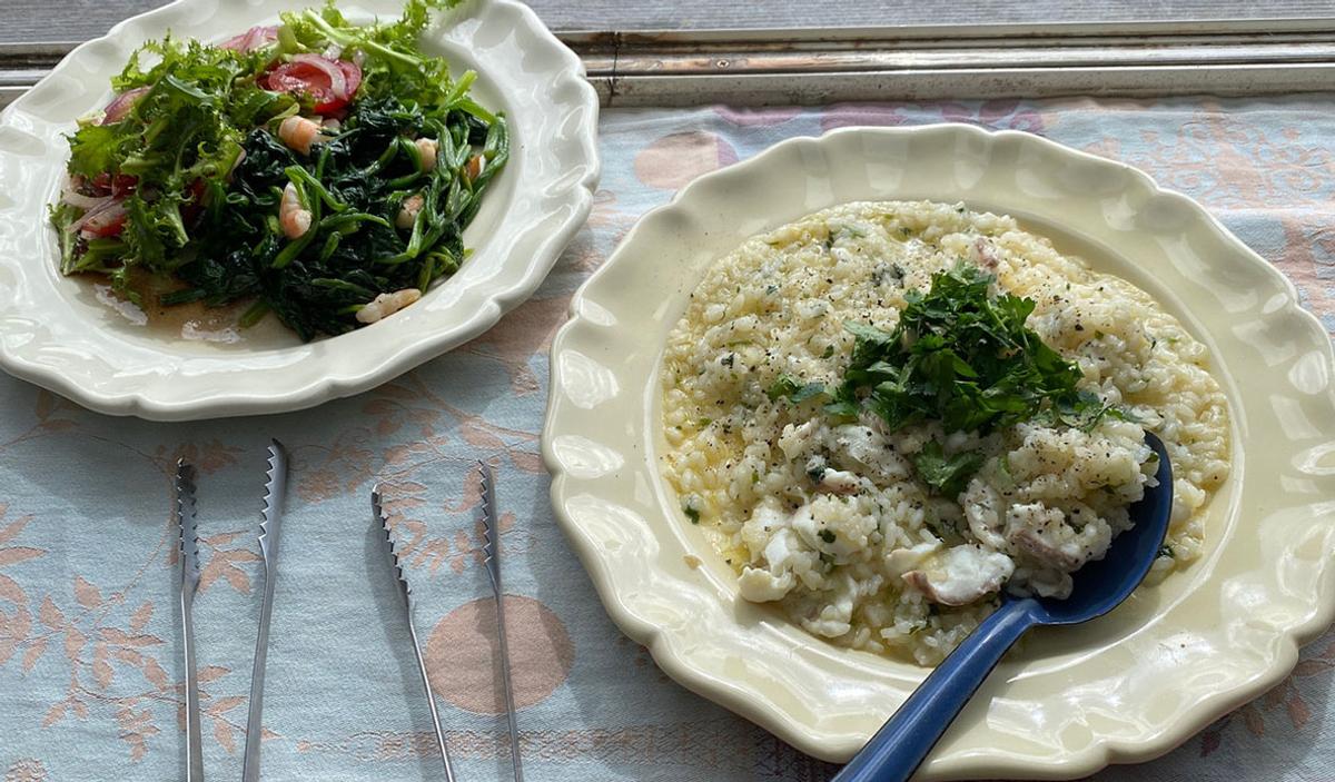 ほうれん草のバター炒め、フリゼレタス、生ハムのリゾット。