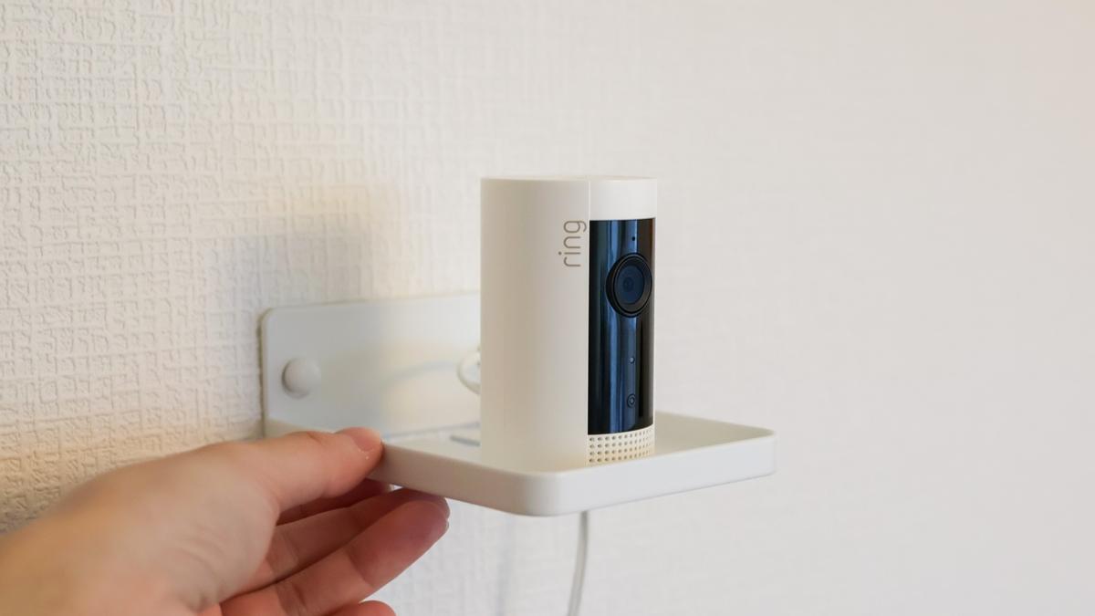 わが家の「Ring Indoor Cam」は底面にネジがあるので、これを外して土台をかませてから固定しました。