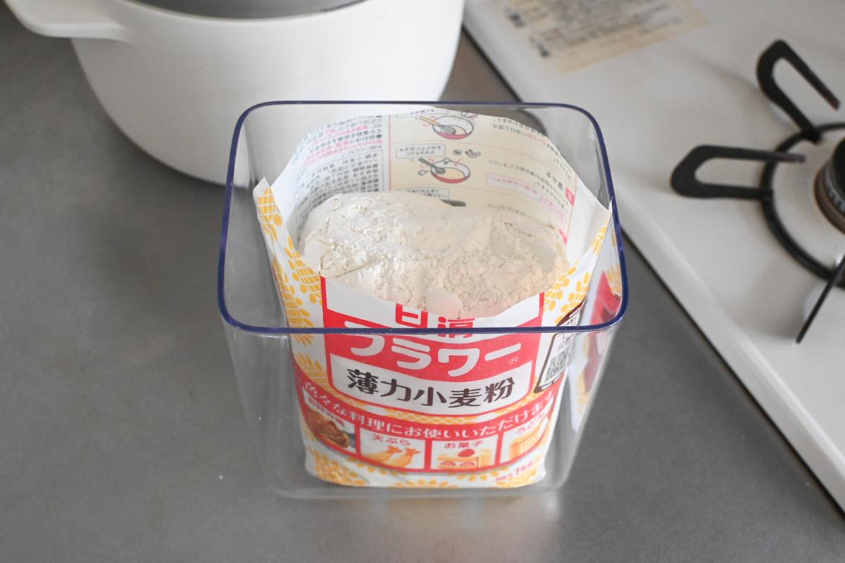 いくつかサイズ展開がありますが、ワイドトールは容量おおよそ2Lの一番大きなサイズで、小麦粉1kgの袋にぴったり。袋ごと入れて袋の上部をカットすれば保存が完了します。