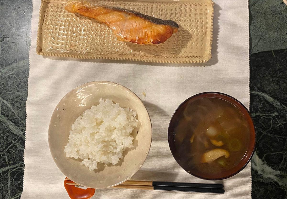 味噌汁を並べ、塩鮭。これにて夕食はおしまい。さっぱりしすぎだなあ。