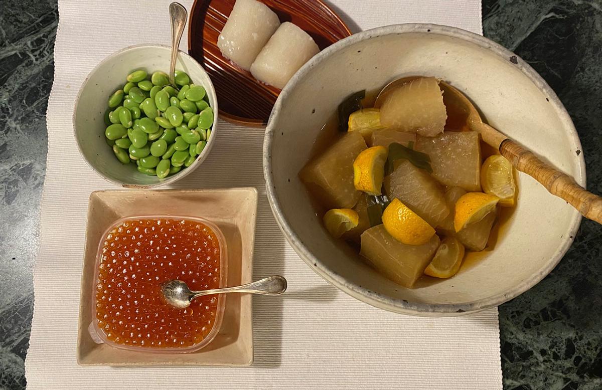 さらりとした和夕食を作ろう!と思い、三浦大根を煮て多田錦を散らす。しばらく本気調理をしていないので、自信ゼロだったけれど、それなりの味(三浦大根に助けられたね)。イクラ、茶豆、べったら漬け、ごはん。