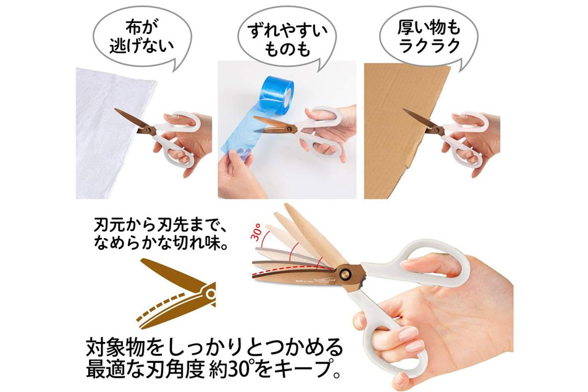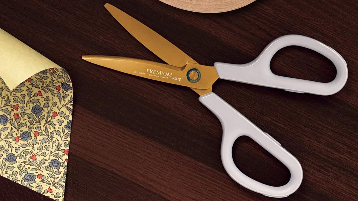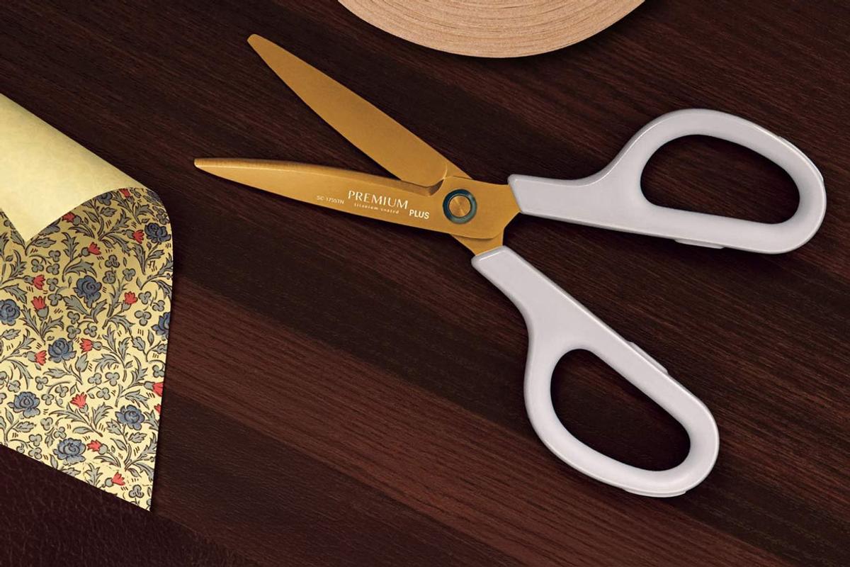 大手事務用品メーカー・プラスのはさみ「フィットカットカーブ プレミアムチタン」は、快適な切れ味と汚れにくさが魅力。