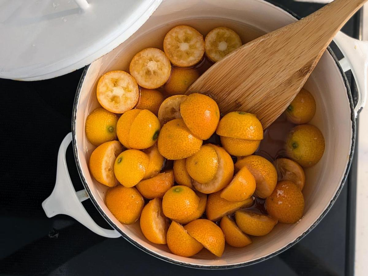 鍋に種をとったきんかんと砂糖、はちみつ、水を鍋に入れます。