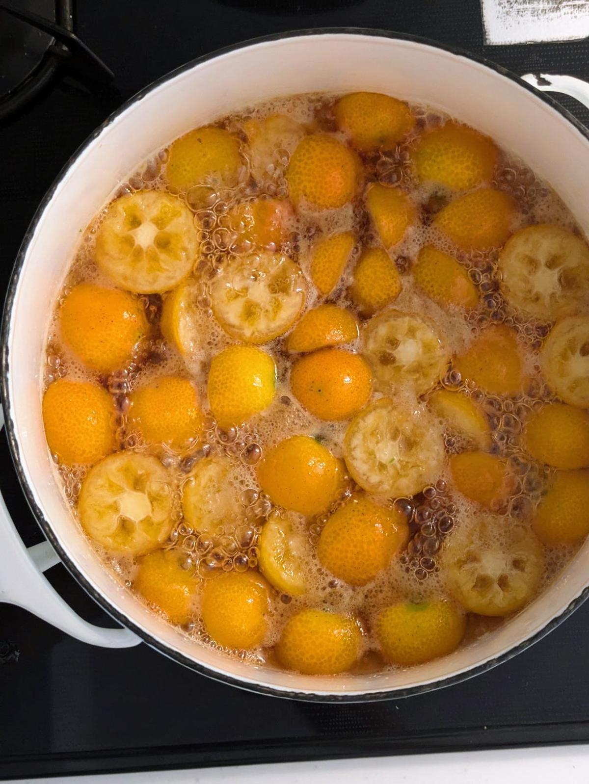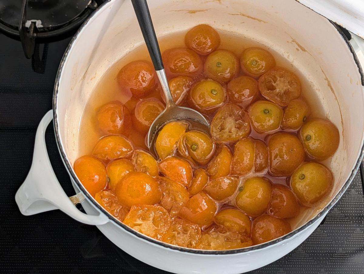 きんかんが透き通り、煮汁にとろみがつくまで15〜20分くらい煮つめます。