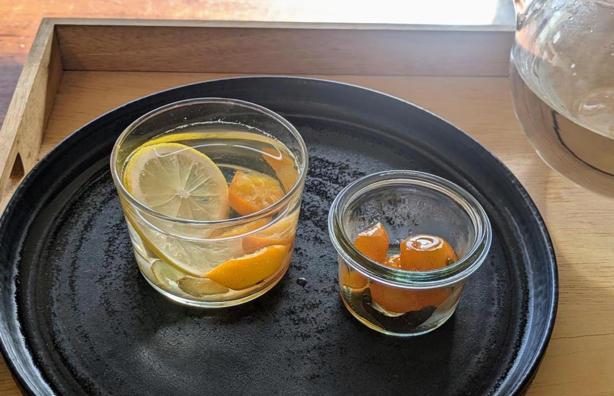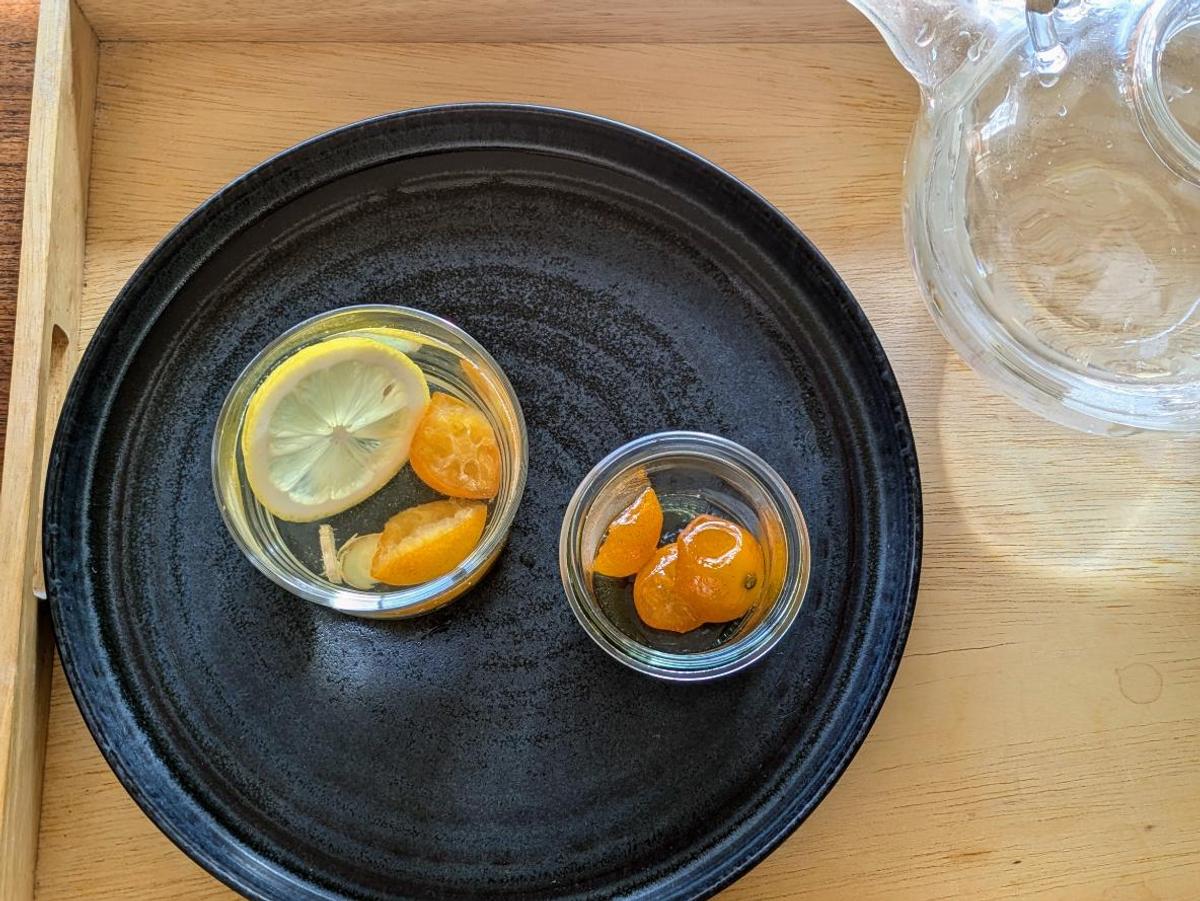 材料をグラスに入れてからお湯を注いで、きんかんとレモンをスプーンで潰しながら、温かいうちにいただきます。