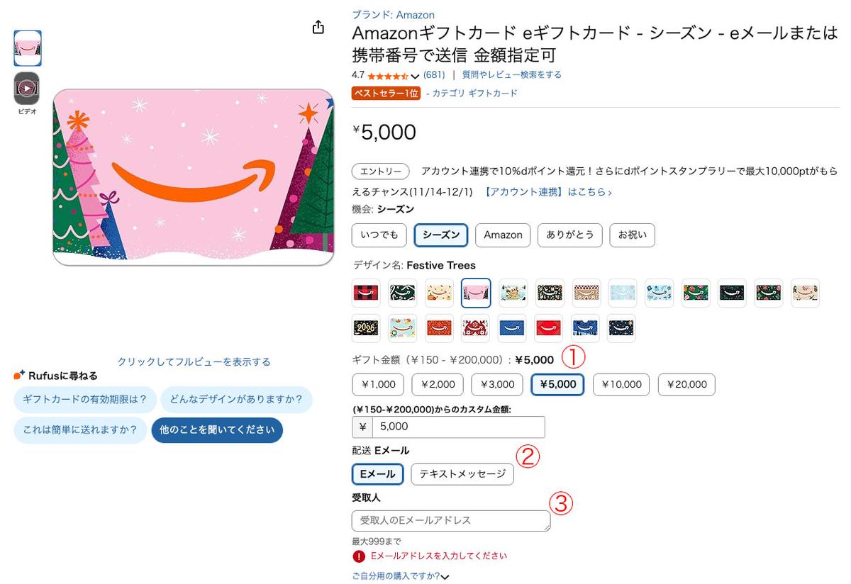 ①Amazonギフトの購入ページを開き、買いたい金額を選択