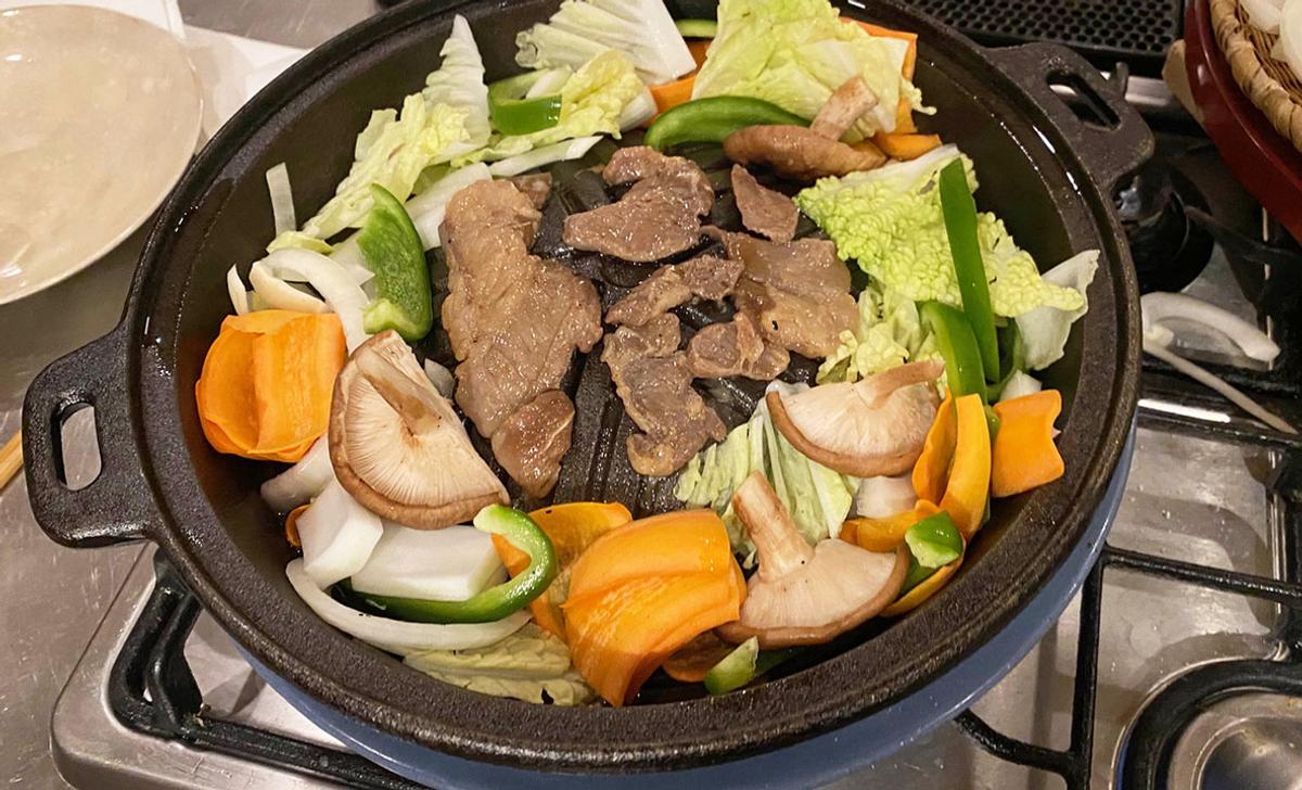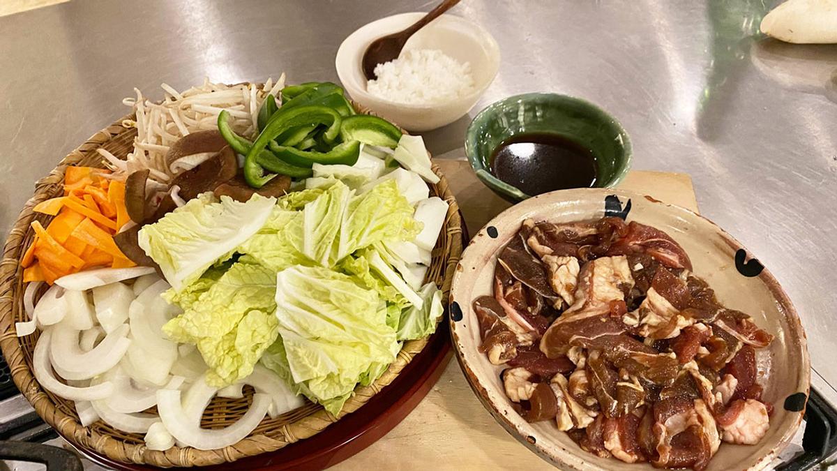 おにぎりごはんの後は、力をつけよう!とジンギスカン鍋。ラム、もやし、ピーマン、白菜、玉ねぎ、人参、椎茸。