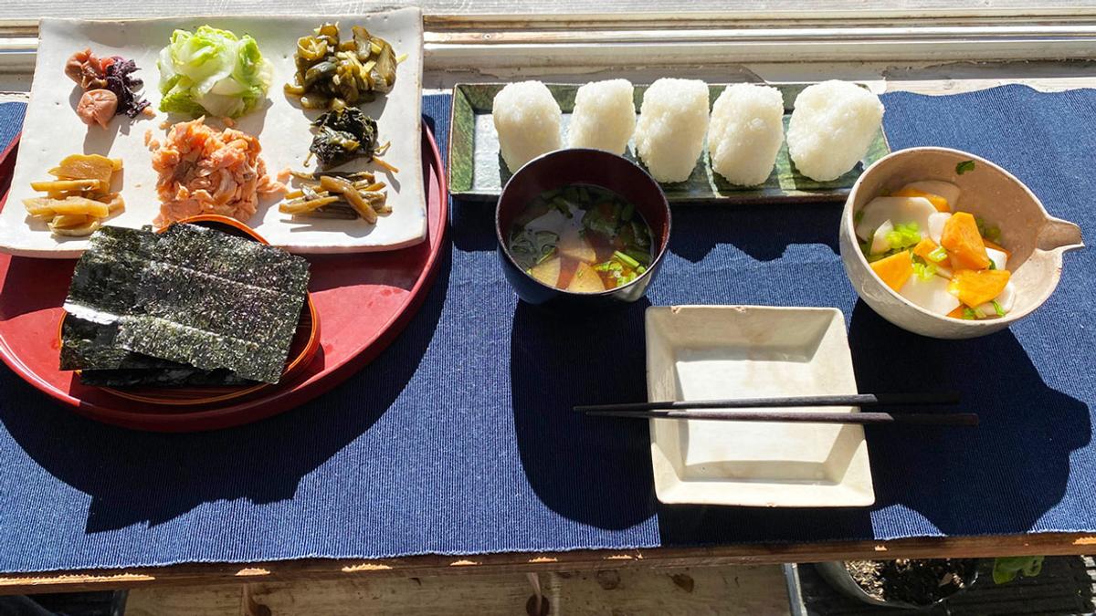 前田家からいただいた白米でおにぎり。このお米がめちゃ美味しい! 山梨県都留市産です(もしかして米どころ?)。梅干し、きゅうりのQちゃん風漬物、ふき煮、生姜煮、全て前田家からの頂き物。ほぐし塩鮭、蕪と柿のサラダ、大根の味噌汁。