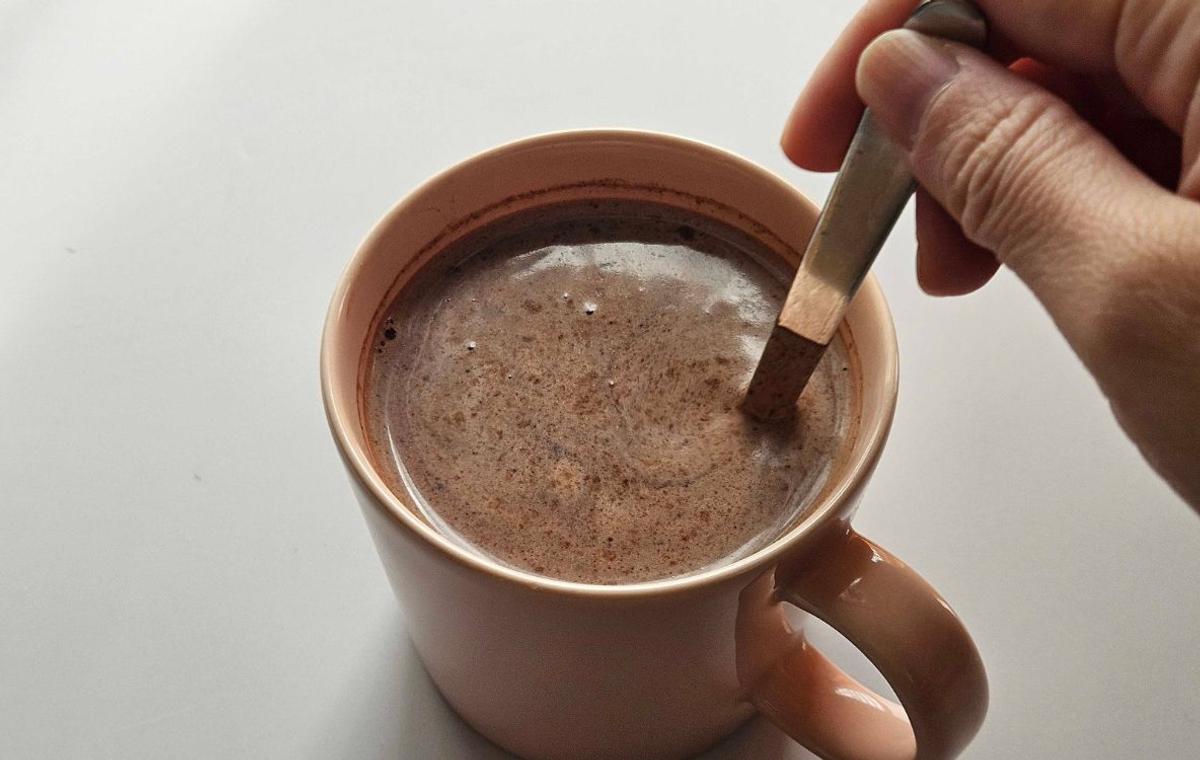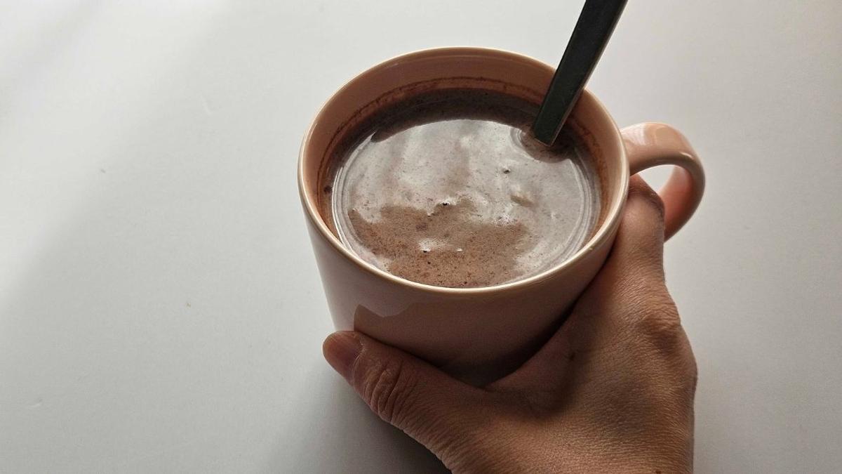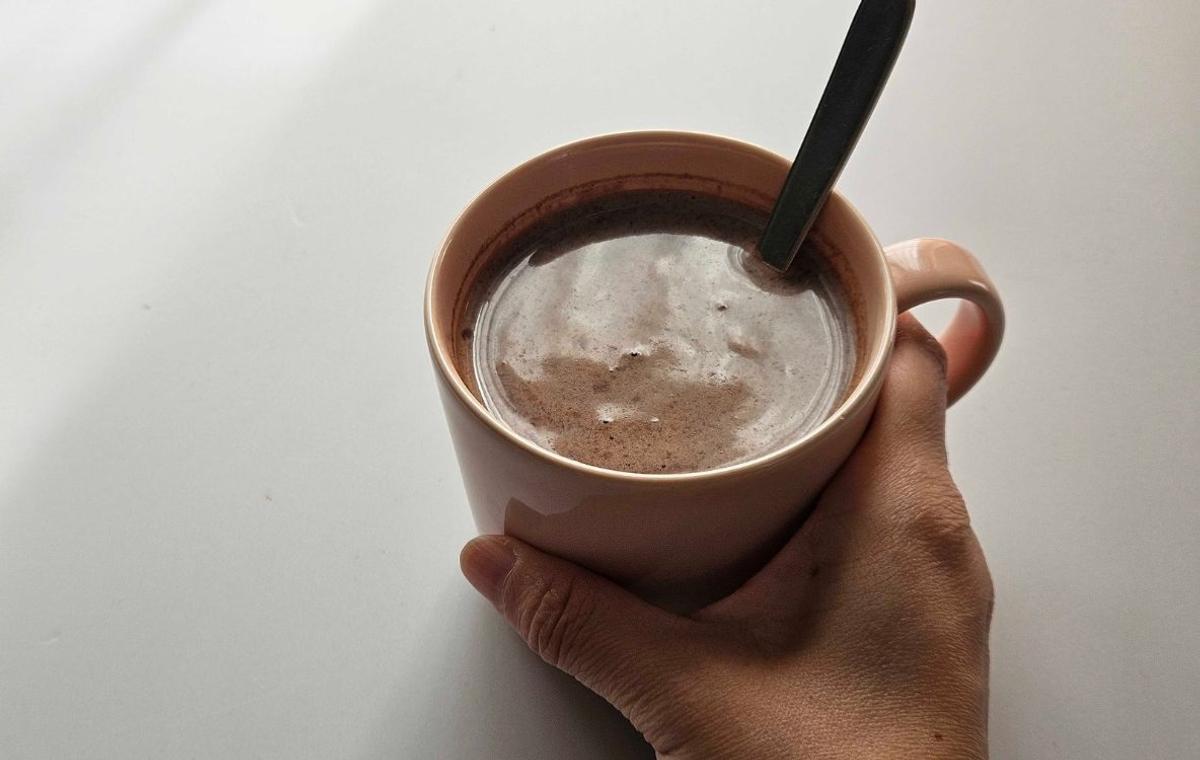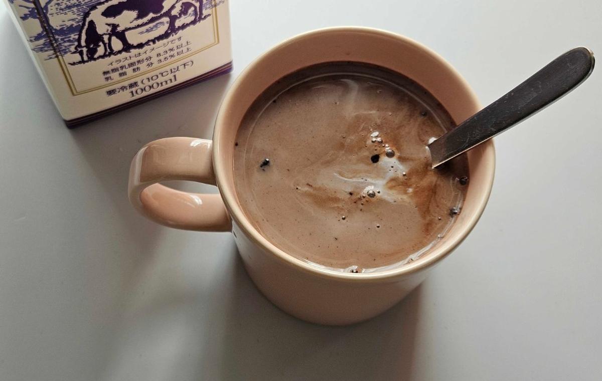 冷蔵庫から牛乳を出してきて注ぎます。冷たいココアとして飲むときはここに氷を浮かべて飲みますが、冬は絶対ホットだなあ。