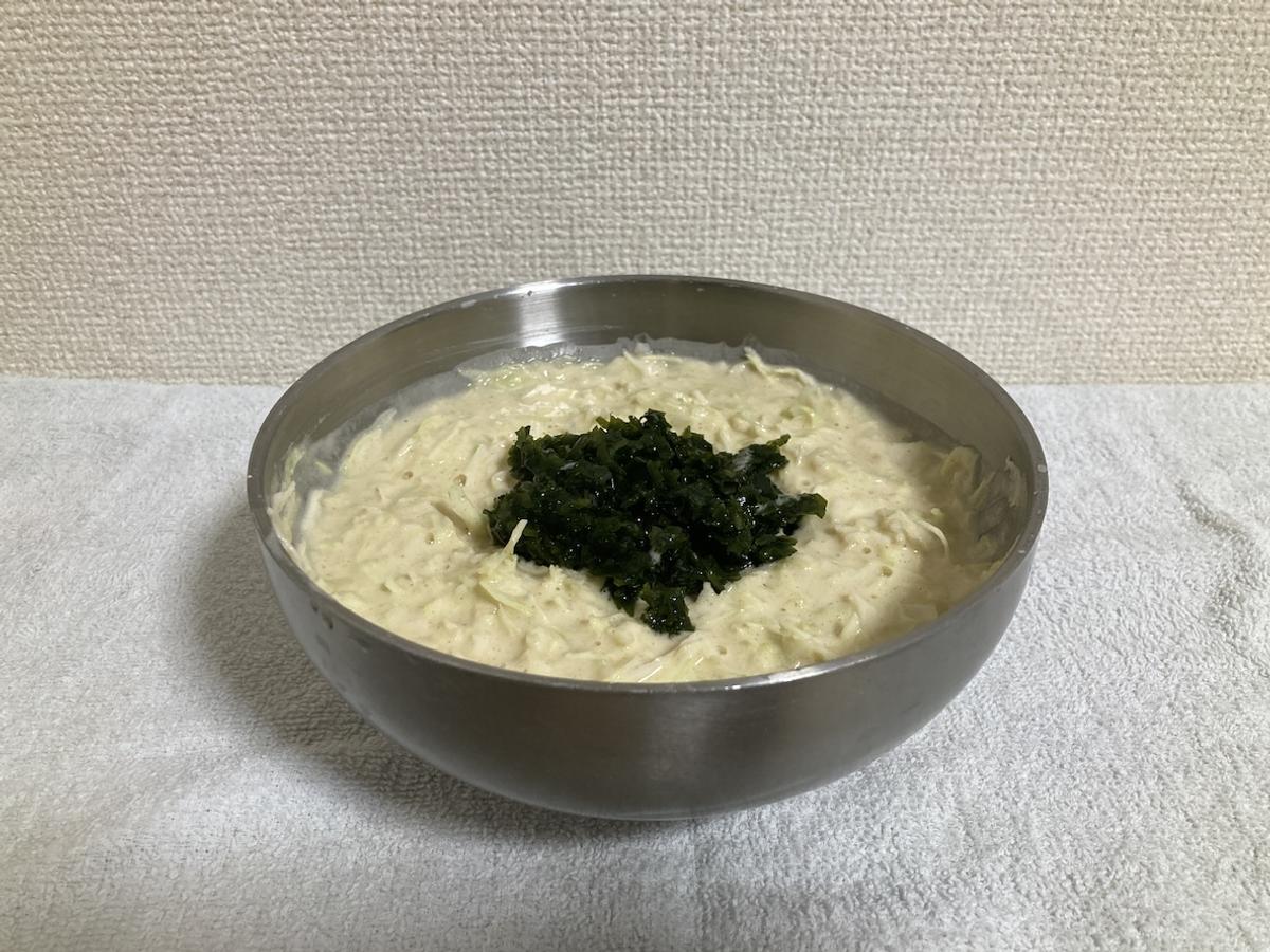 つくり方はお好み焼き粉に具材を入れた生地に、わかめペーストを投入するだけ!