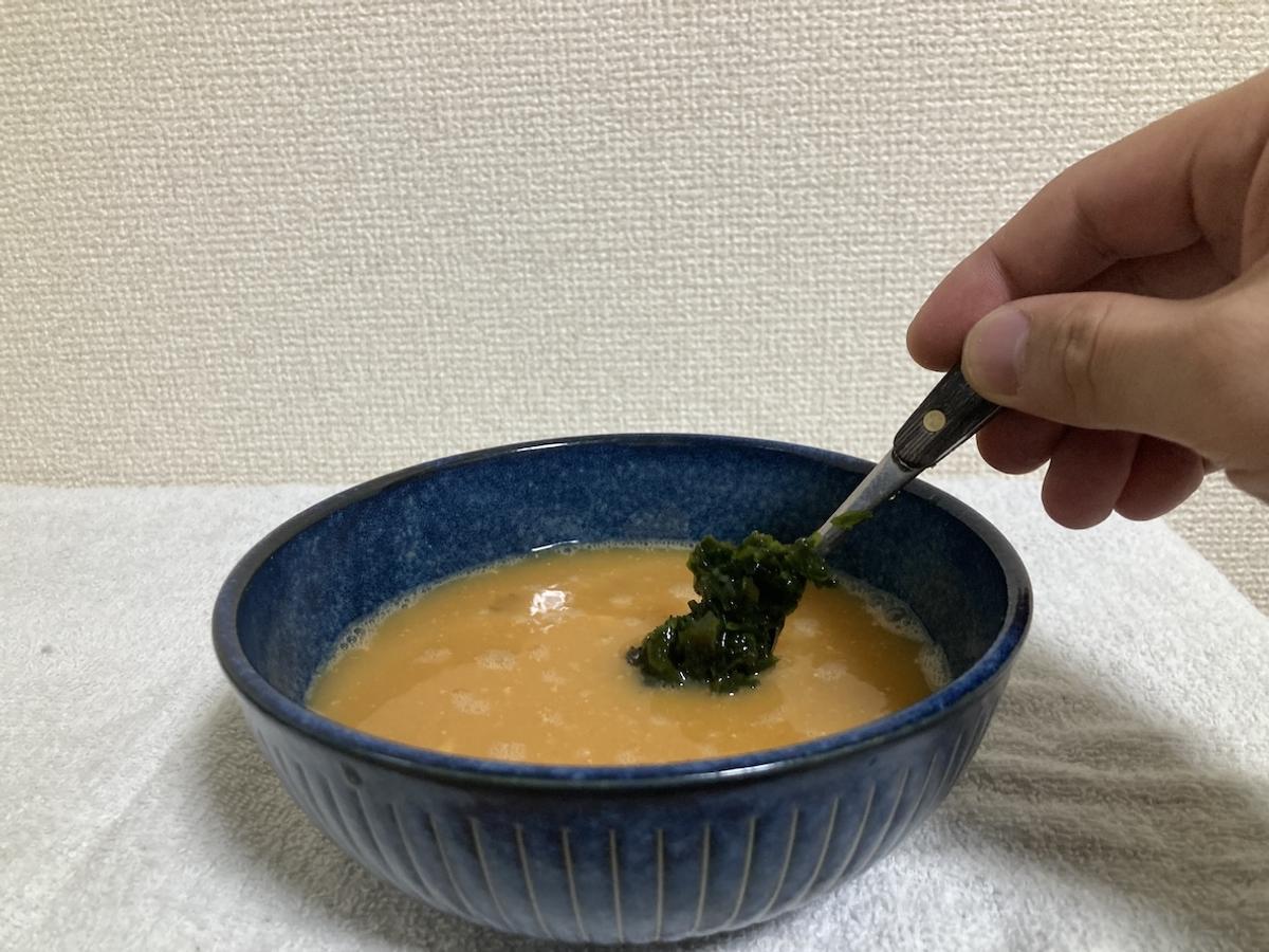 濃い緑のビジュアルにワクワク。わかめはペーストにするだけで、素早く消化吸収できるようになるのも特徴です。