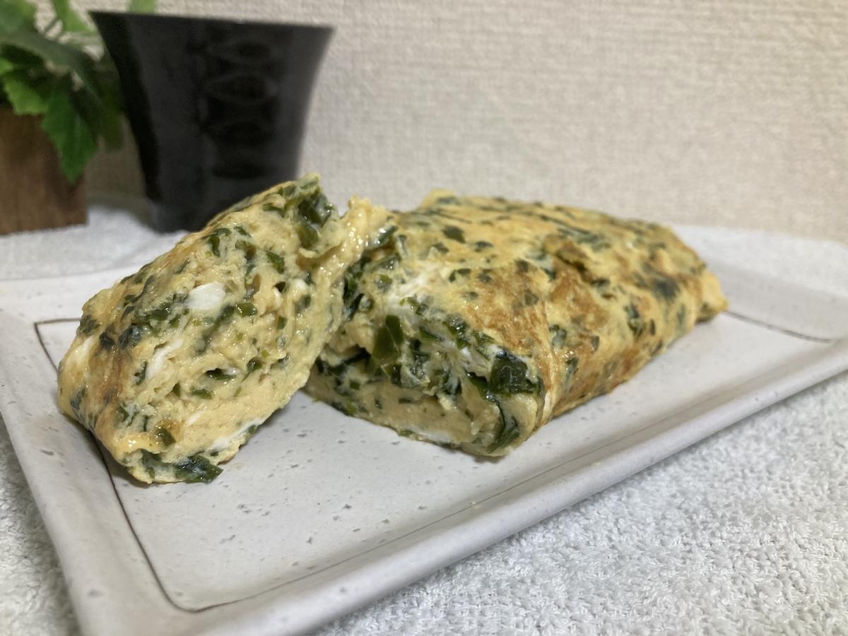 溶いた卵に顆粒出汁、醤油、塩、水、わかめペーストを入れて、よくかき混ぜます。フライパンに油をひき、焼きあげて完成です。