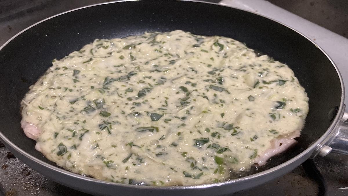 フライパンに油をひいて、豚ロース肉を軽く焼いたら、生地を入れて両面に焼き目が付けば完成です。