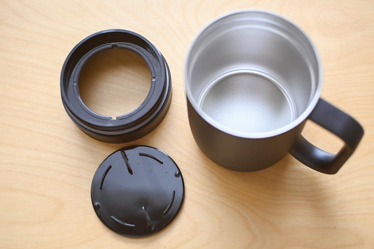このマグカップ、ふたをしたまま360度どこからでも飲めるのが便利! ホコリも気にならず、保温性能もバッチリです。