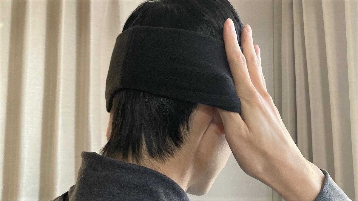 装着時は、洗顔時のヘアバンドのように被るだけ。太い方が首の後ろ、細い方が額側です。