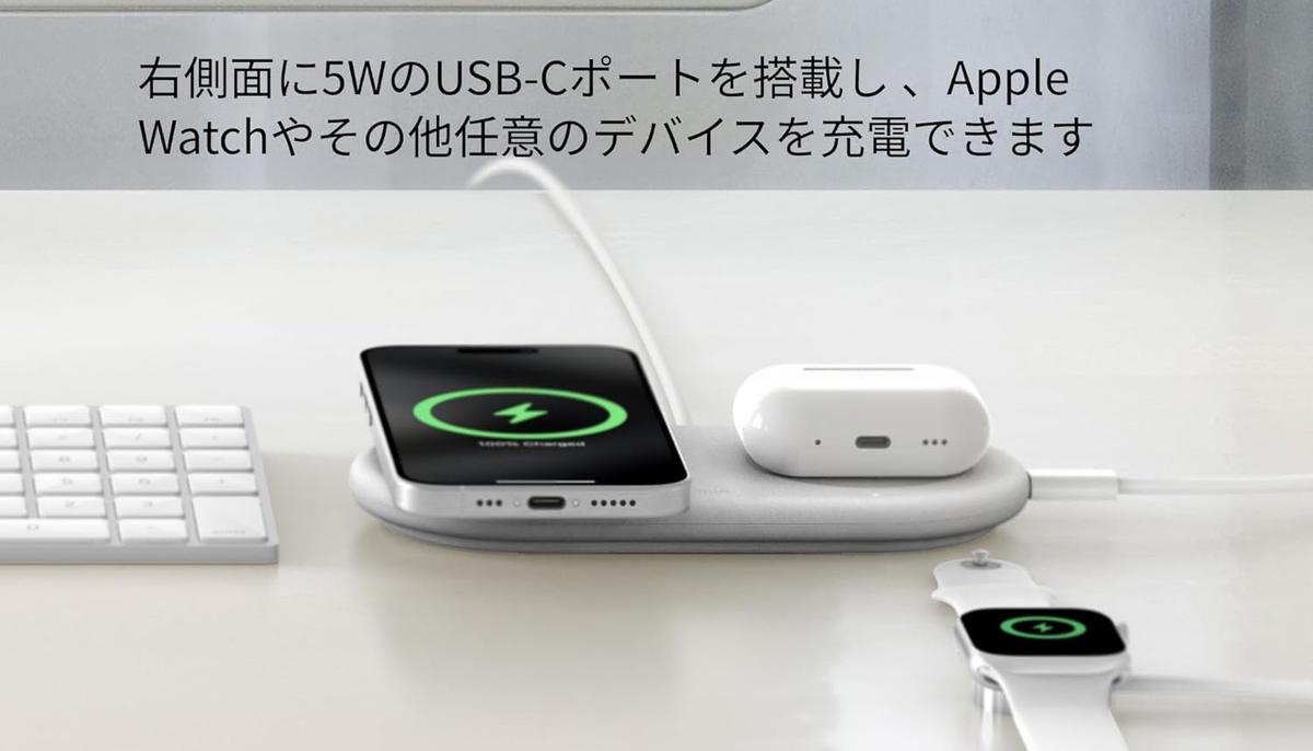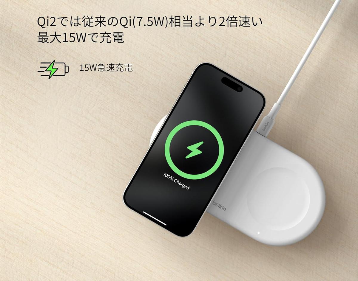 Qi2と呼ばれる新しい規格にも対応しており、最大15Wでのワイヤレス充電が可能。充電速度の遅さがワイヤレス充電のデメリットと言われていましたが、Qi2規格によりそれもクリア