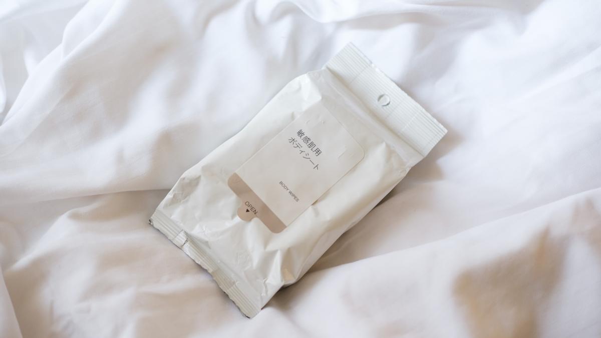 トラベルグッズ売り場で見つけた「敏感肌用ボディシート」は、天然由来成分100%(※天然成分を化学的に反応させた成分を含む)にこだわった、低刺激性のボディシート。