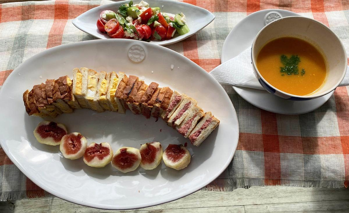 人参と玉ねぎのポタージュ。カプレーゼ的サラダ、イチジク。サンドイッチ(卵焼きとチーズ、コンビーフと玉ねぎ)。