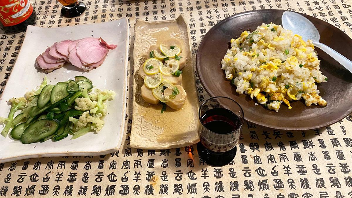 自家製ハムと青野菜(胡瓜とカリフローレ)、里芋煮(すだち)。玉子チャーハン。