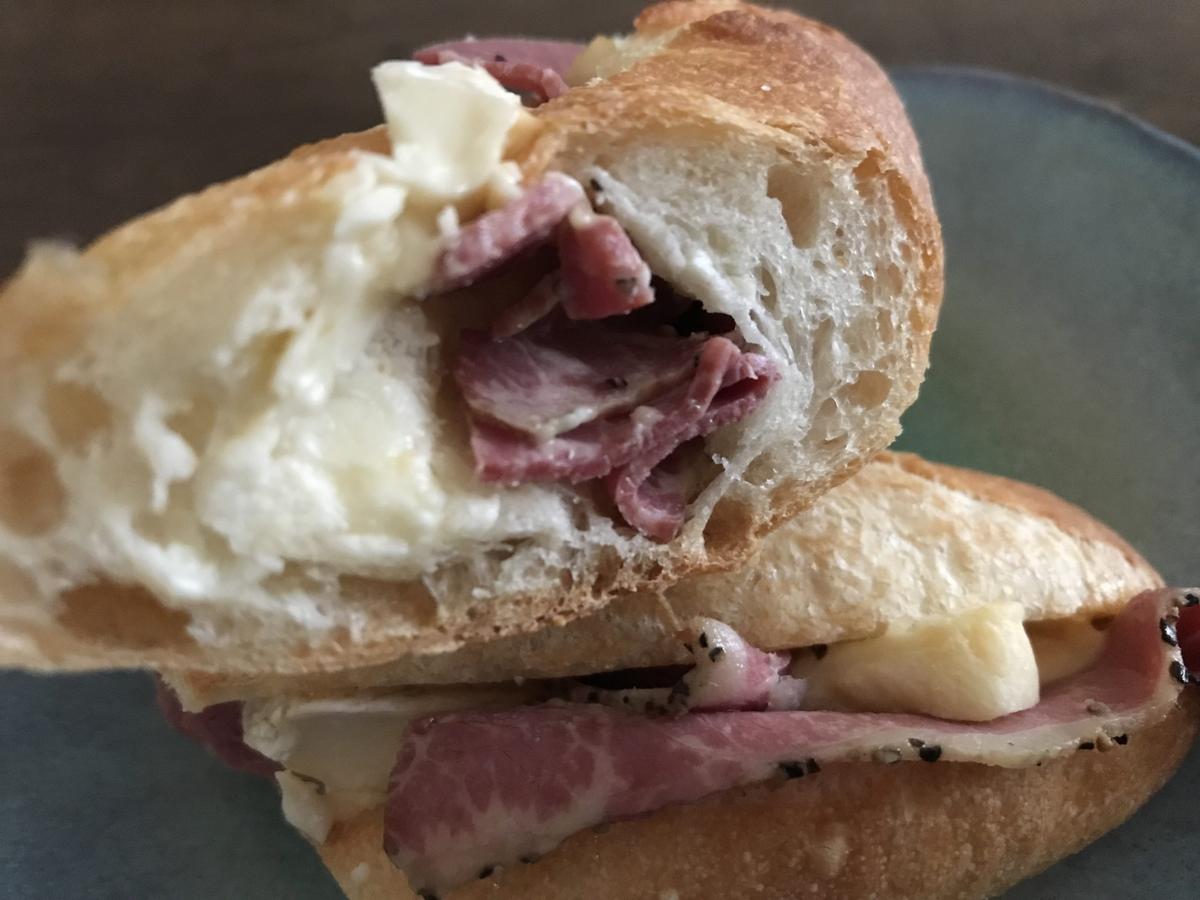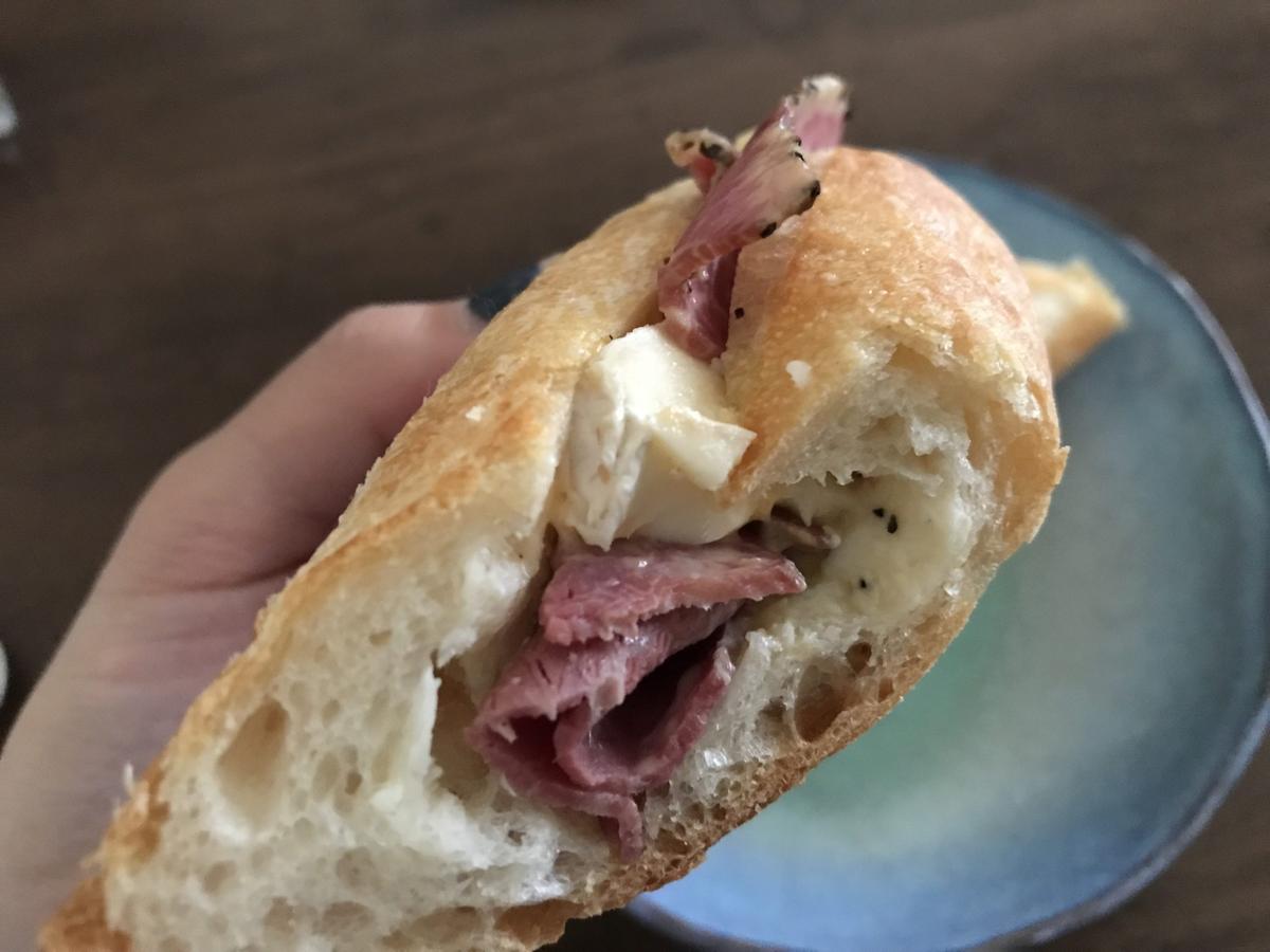 ほどよい歯応えのあるバゲットに、パストラミビーフ、カマンベールチーズ、玉ねぎが挟まっています。バターの風味が効いていておいしい〜。本当は毎日食べたいけど、ひとつ600円くらいするので、なるべく我慢するようにしています。