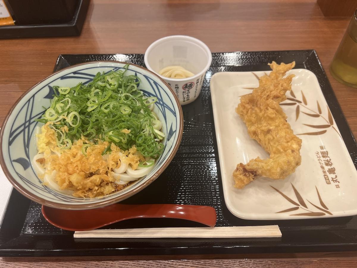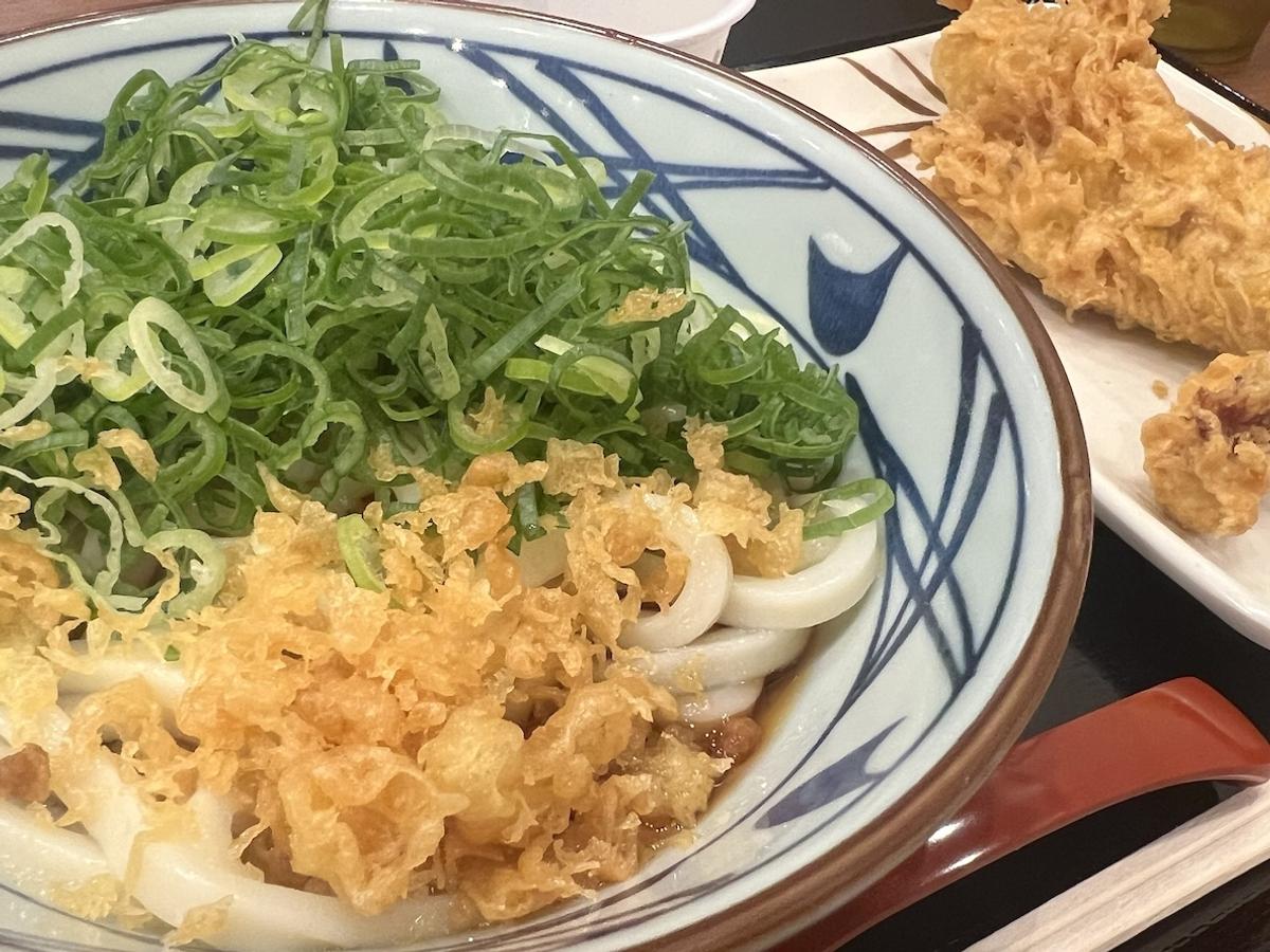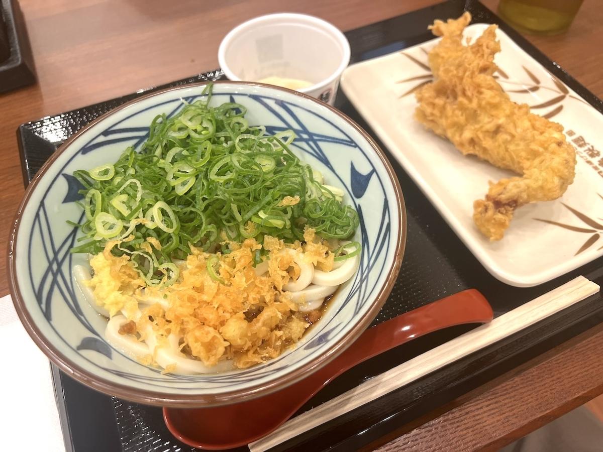 頼んだのはぶっかけうどん普通盛り。かしわ天も付けて590円(税込)、やっぱり丸亀は安い!