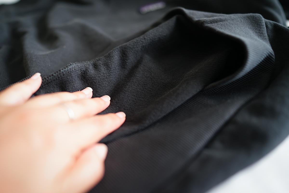特に空気をたっぷり含むニットが活躍する時期こそ、このポーチの真価が問われるかも。試しに、ニット系の衣類も収納してみましたが、畳み方を工夫すればMサイズでも収納できました。